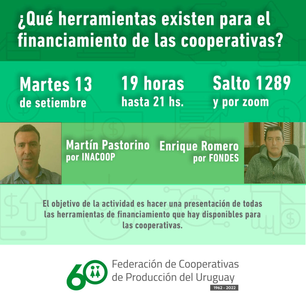 ¿Qué herramientas existen para el financiamiento de las cooperativas? ¿Cuáles son los montos a los que se puede acceder y cuáles son los requisitos? ¿Qué se puede financiar? Sobre esto conversaremos el próximo martes 13 de setiembre a partir de las 19 en encuentro con Martín Pastorino (Inacoop) y Enrique Romero (Fondes). La actividad es […]