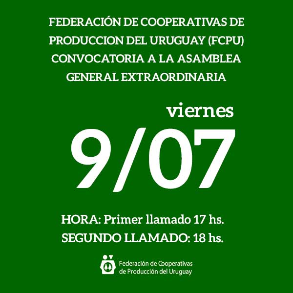 La Federación de Cooperativas de Producción del Uruguay (FCPU) convoca a sus afiliadas a la Asamblea GENERAL Extraordinaria. FECHA: VIERNES 9 de JULIO de 2021 LUGAR: La Asamblea...