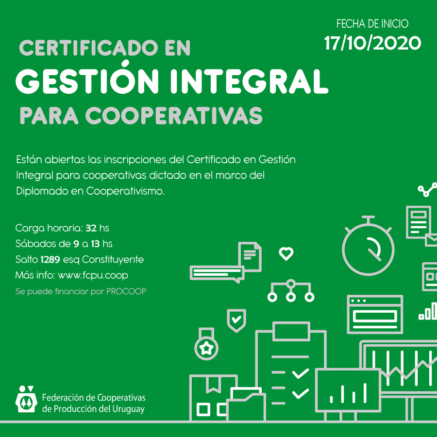 Hasta el 16 de octubre de 2020 están abiertas las inscripciones del Certificado en Gestión Integral para cooperativas dictado en el marco del Diplomado en Cooperativismo. Carga horaria:...