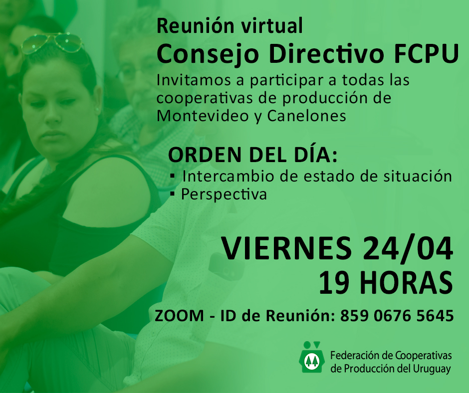 Reunión virtual del Consejo Directivo de FCPU Invitamos a participar a todas las cooperativas de producción de Montevideo y Canelones. Orden del día ▪️Intercambio de estado de situación...