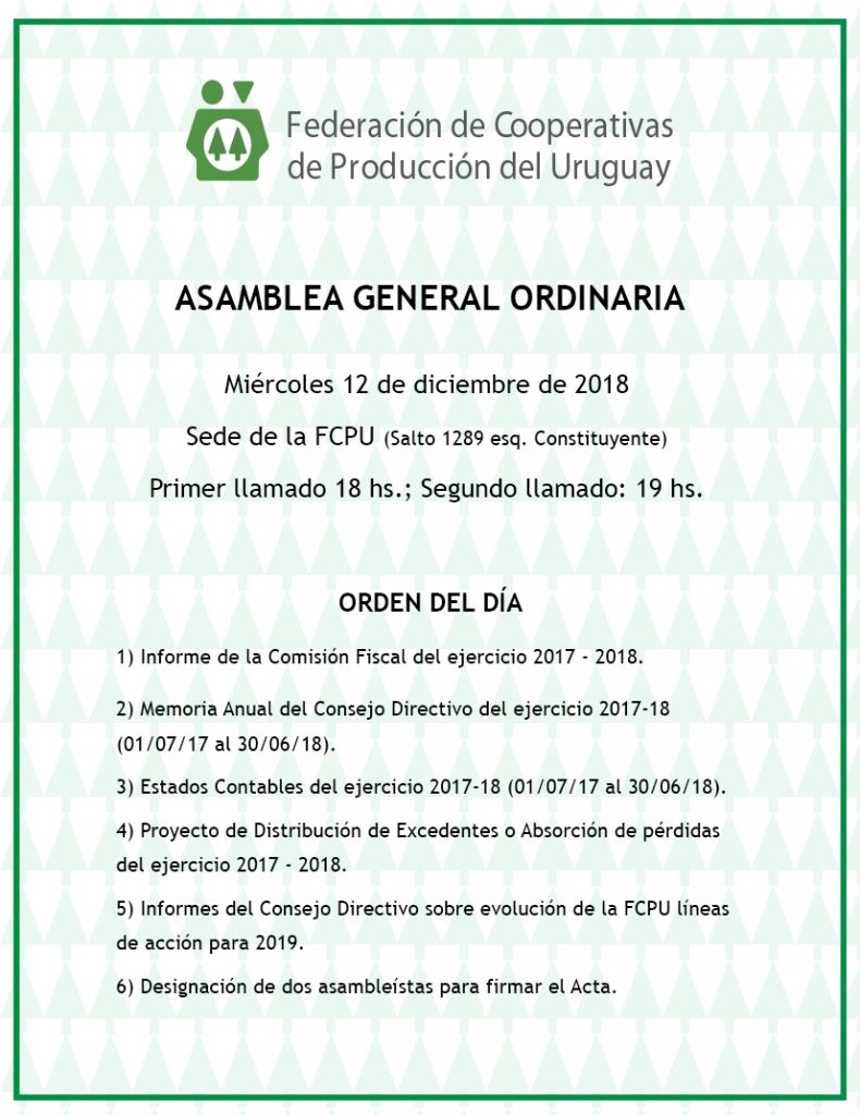 Fecha: miércoles 12 de diciembre de 2018 Lugar: Sede de la FCPU (Salto 1289 esq. Constituyente) Hora: Primer llamado 18hs.; Segundo llamado: 19hs. ORDEN DEL DIA Informe de...