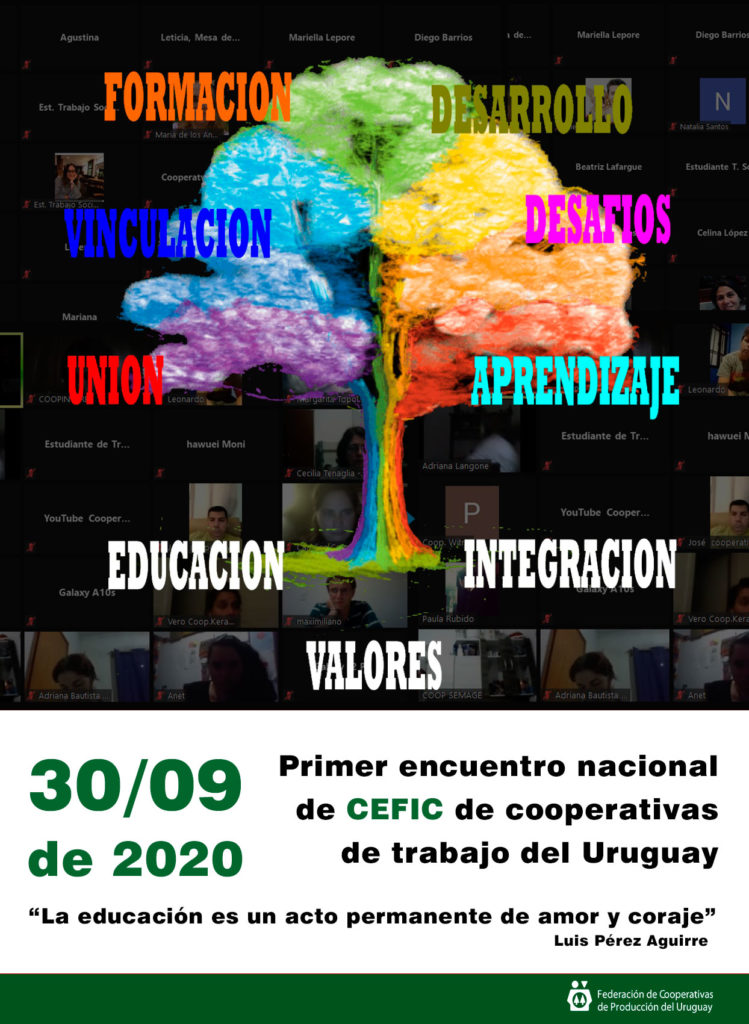Luego de la bienvenida por parte del moderador del CEFIC de FCPU, se invito a los participantes a presentar a su cooperativa y mencionar en el chat d el zoom, tres palabras que representaran según ellas al CEFIC. A partir de ellas, al final del encuentro se construiría entre todos el árbol del CEFIC cooperativo.