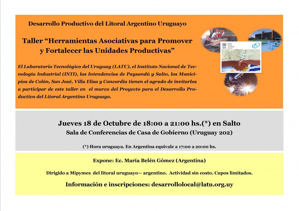 En el marco del acuerdo de cooperación para el desarrollo productivo del litoral uruguayo argentino, el Instituto Nacional de Tecnología Industrial de Argentina (INTI) ha realizado gestiones para contar con talleres sobre economía social y asociativismo. Estos talleres serán brindados por la Ec. María Belén Gómez de Río Uruguay Seguros, institución que viene trabajando en el tema en Entre Ríos, Argentina.